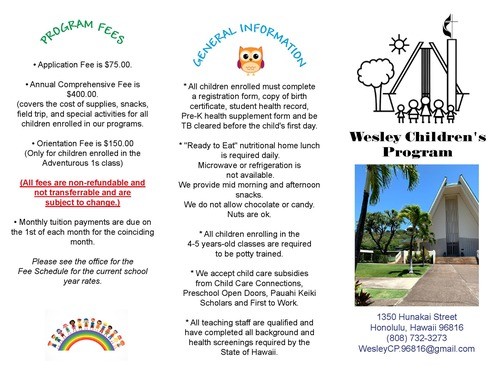 Wesley Children's Program is a year-round program serving families in and around the Kahala area. Now accepting applications for the upcoming school year! Please reach out to our Preschool Director for more information.